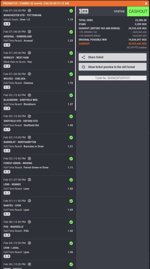 One punter built a long ticket and chose to CashOut UGX 30M while one match was still in play.